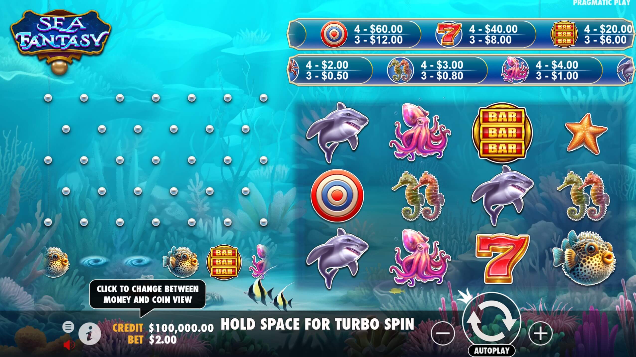 Sea Fantasy membawa pemain menyelam ke dunia bawah laut penuh warna. Latar belakang menampilkan karang, cahaya biru laut, serta efek gelembung air yang bergerak aktif. Detail visual ini menciptakan atmosfer santai sekaligus menegangkan.